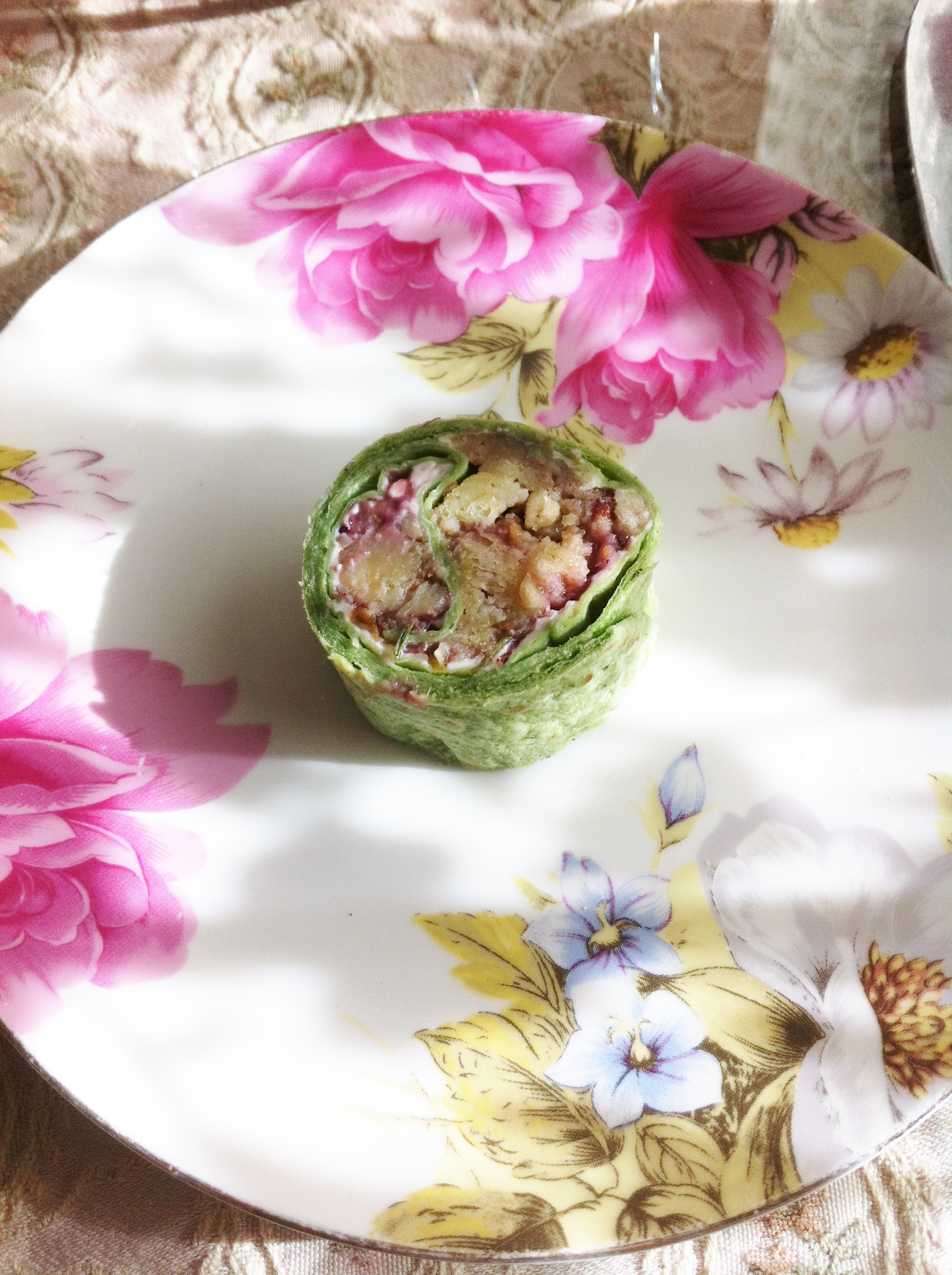 This was the stuffing roll. Yes, I said STUFFING!! It was remarkable! I’m a stuffing FAN, so when she described this one I knew I was going to have it first. It was interesting + delicious. Wrapped with a spinach tortilla (I’m guessing), and -BONUS- the stuffing had cranberry in it!