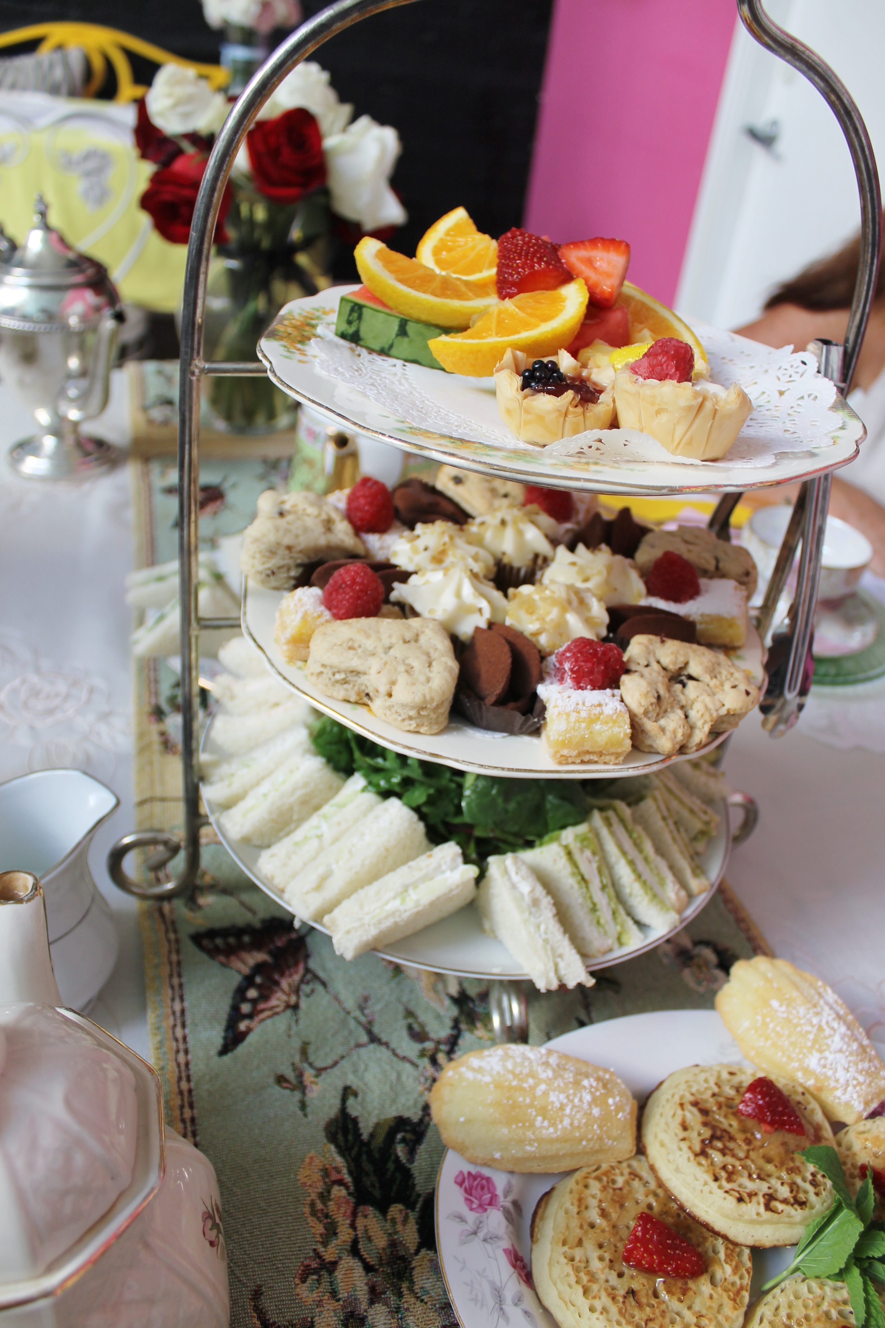 Scones were cute. Heart shaped. (sigh) But I’ve had waaay better. They were too hard. Oh yeah, and we searched + searched for the scone filings, then were reminded they were on the top tier!? Here’s what they looked like: