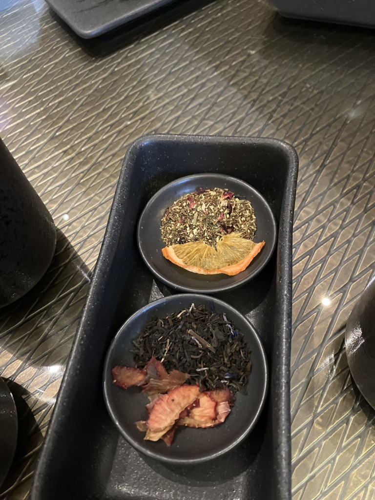 The sweetest girl came to greet us. She explained the menu, what we had to pick out for teas, we all said ‘thank you’, then she walked away. We THOUGHT we all had to agree on what teas to have together, so the 4 of us deliberated. When she came back and asked us what we would be having, almost in unison we recited our request. When she turned to the other girl, were like- “OHH! We each get to pick??” We didn’t get it at first!? Hehe. The menu was kind of confusing, but we finally got it. So if you get there: what they have under each “H” word are their blends. You can pick one or combine 2 of those. They also have classic teas listed. While we were deciding, she was bringing us containers filled with the blends for us to smell from that tea bar I showed you. I’m familiar with that process, other tea houses do that. My OCD doesn’t like it (breathing in tea other people breathed on), but I participated this time as I was fully immersed in the event. You get two flavors of tea to have with your service. I’ll tell you my choices, and share what it says on their menu.