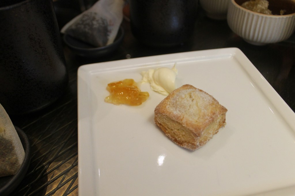 It was a plain scone, nice crunchy outsides with fluffy insides. Could have used some salt. The yuzu jam was new. I’m used to the strawberry or raspberry that’s usually put out. But this one had a good bite to it, the pieces of rind. Reminded me of marmalade. And their devonshire cream was real smooth. Everything together made complete bites of goodness.
