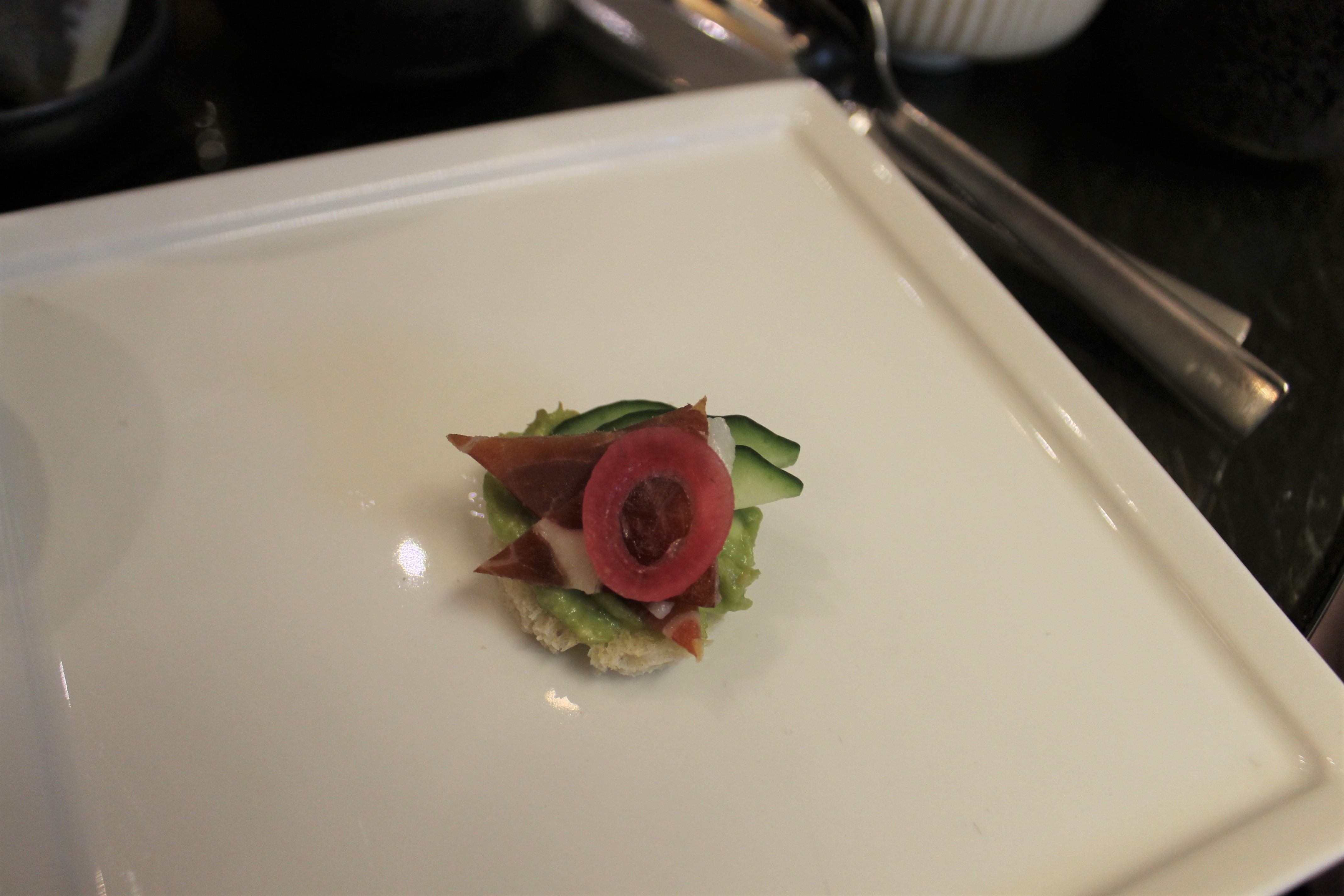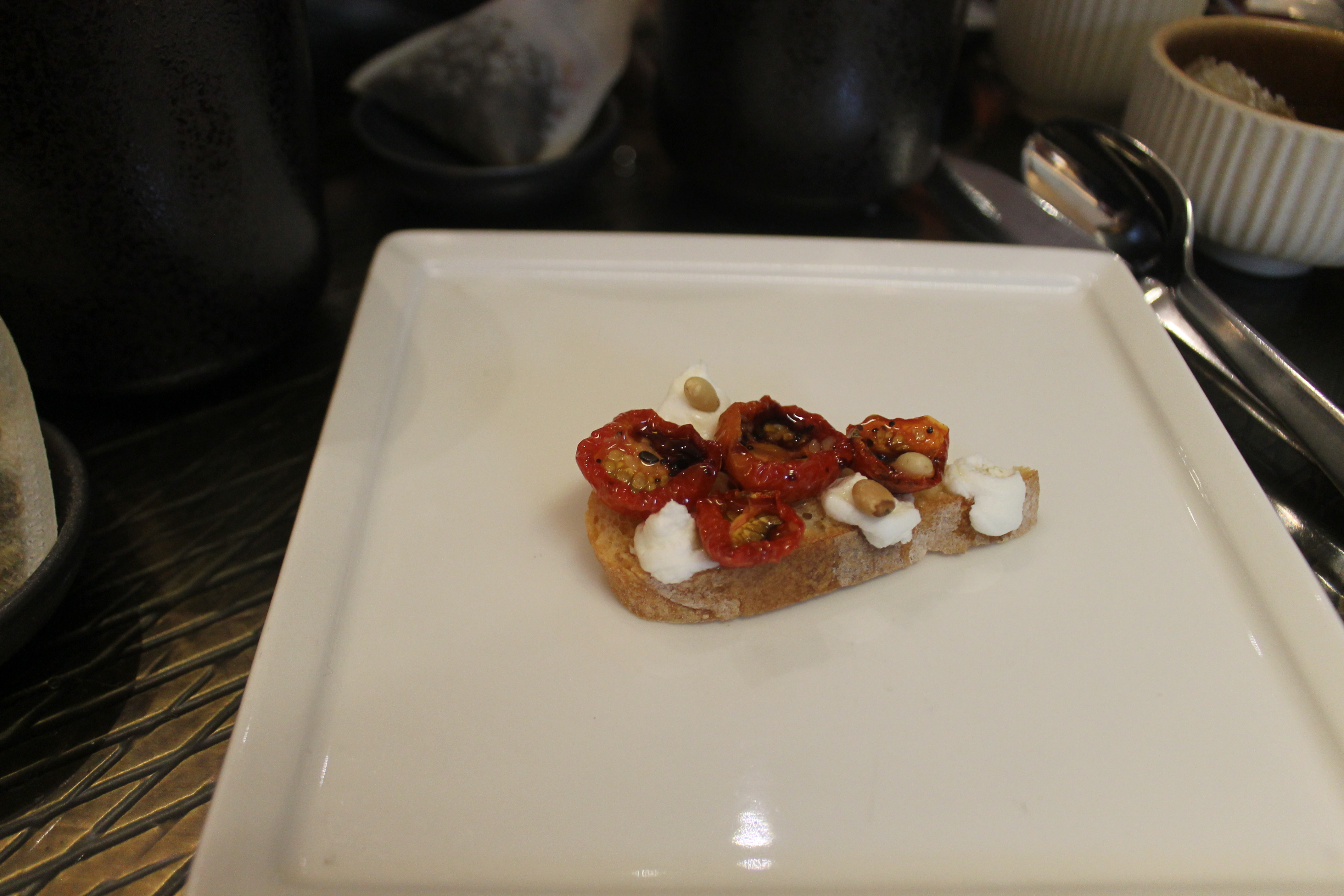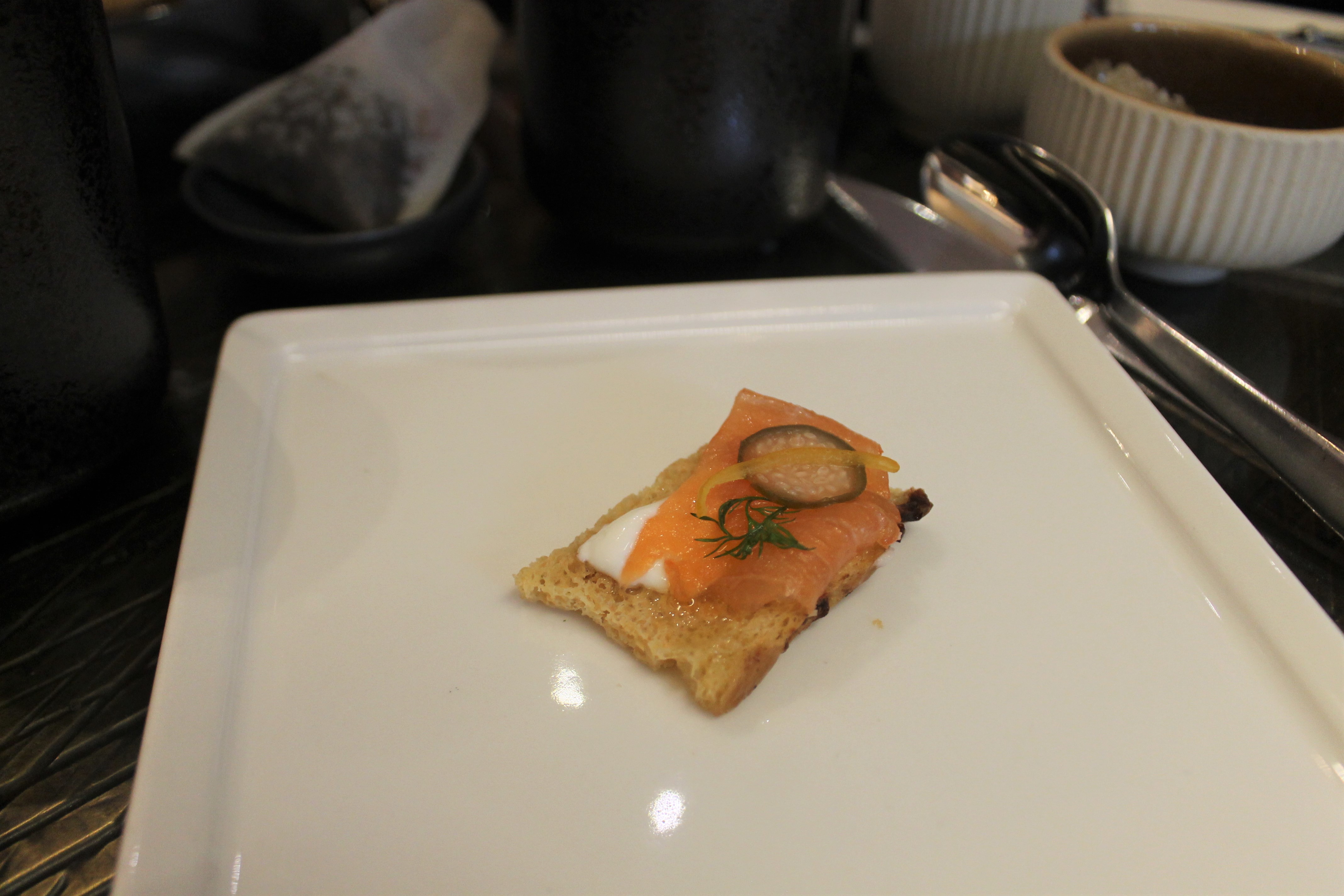 Smoked Salmon (labneh, focaccia crostini, vanilla oil, caper berries, truffle honey) – I have a small mouth, so this was 2 bites for me. Um, exquisite! That truffle honey was everything; I didn’t even know there was such a thing?! And that piece of dill packed such a nice note at the end.