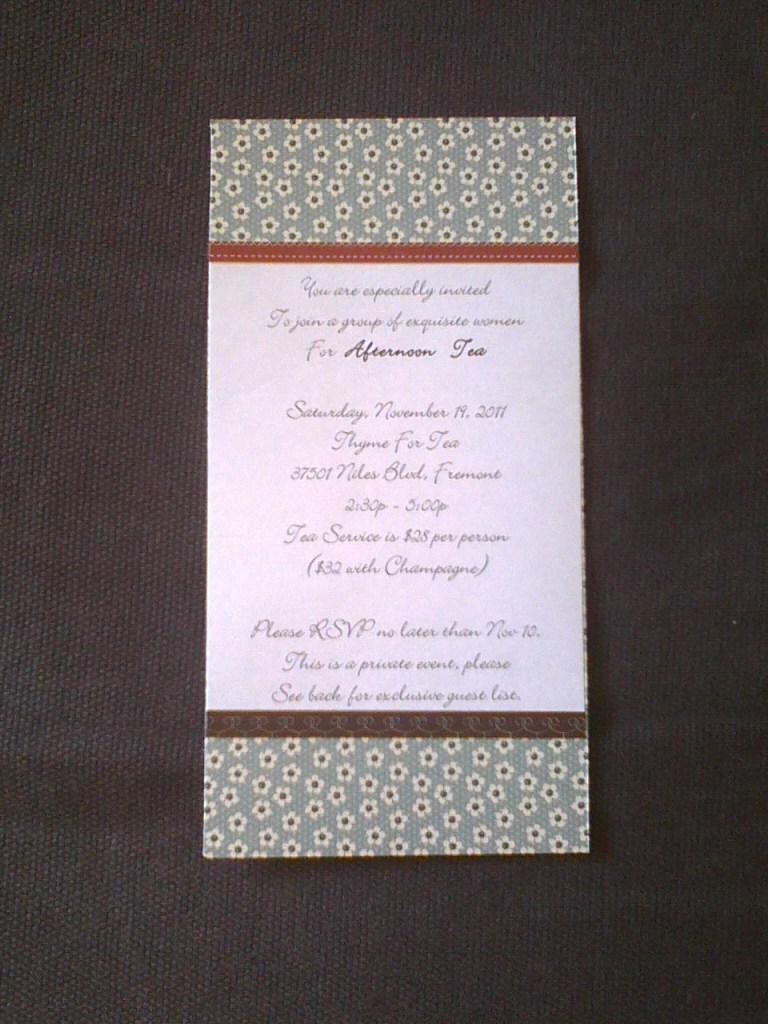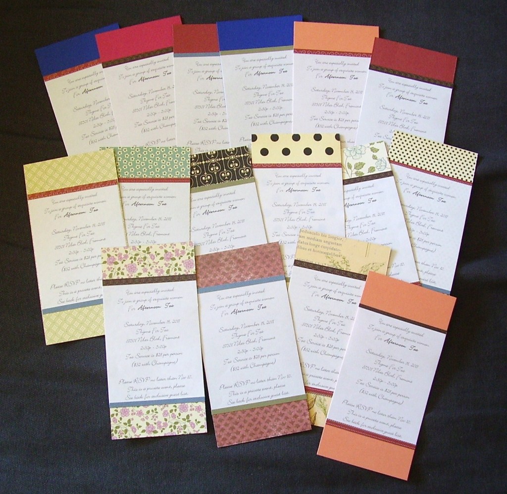 Invitations – One of my friends was a big scrapbooker. She would host scrapbooking nights and invite me. I came to a few, so I had all these supplies. Being a longtime event planner prior to this, I knew that the invites set the tone for the gathering. I thought too that this would be a good time to use up all the stuff I had + practice my DIYing skills…so I handmade each of them! (Another event planning tip: make more than you need!)