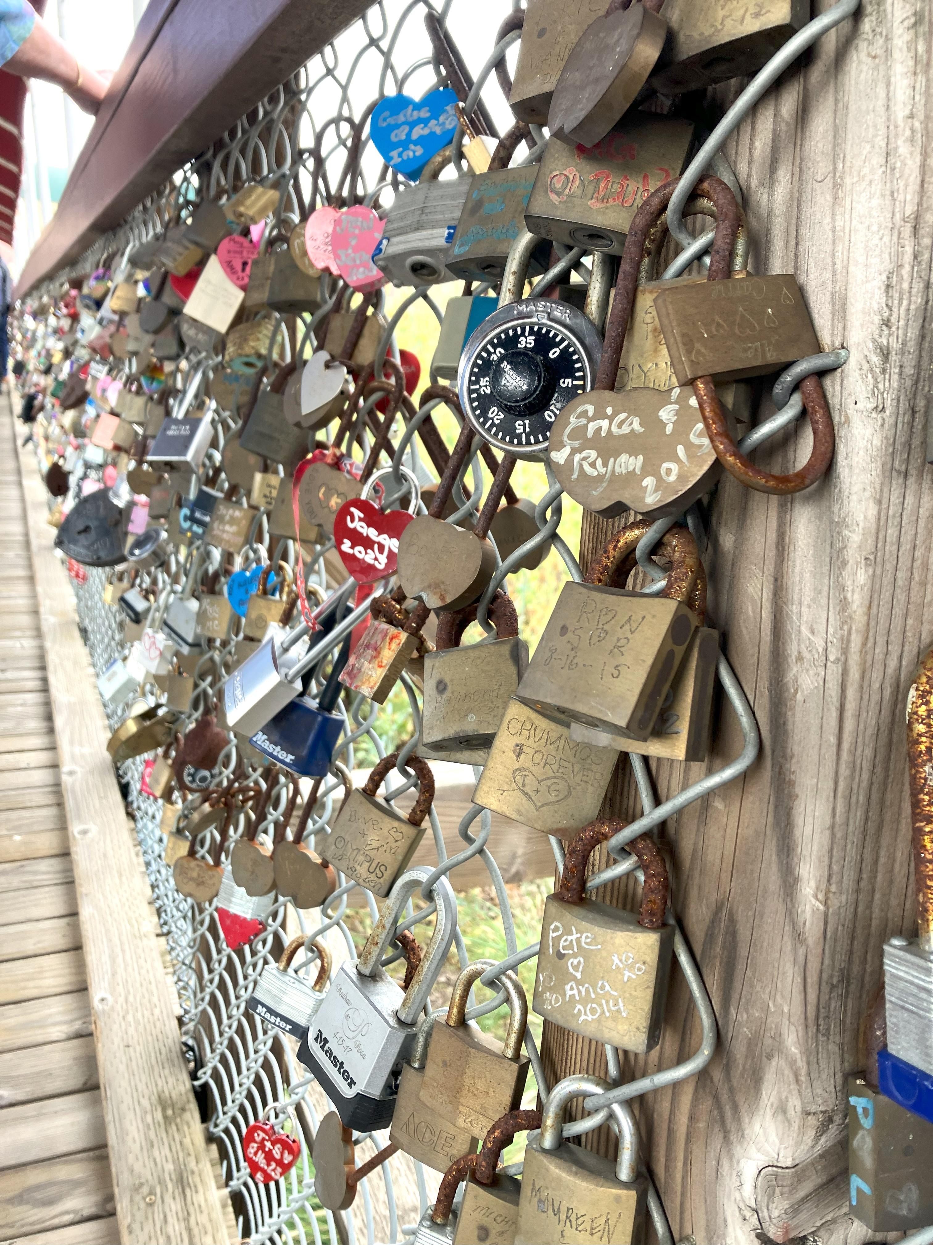There’s a short wait where we stand amongst dozens of decorated locks. Just like they do in Paris, visitors bring love locks and attach them to the fence. An adorable sight! And right before you get to the train, there’s a professional photographer who will take your party’s photo like they do for you on cruises. Okay, now to the track!!