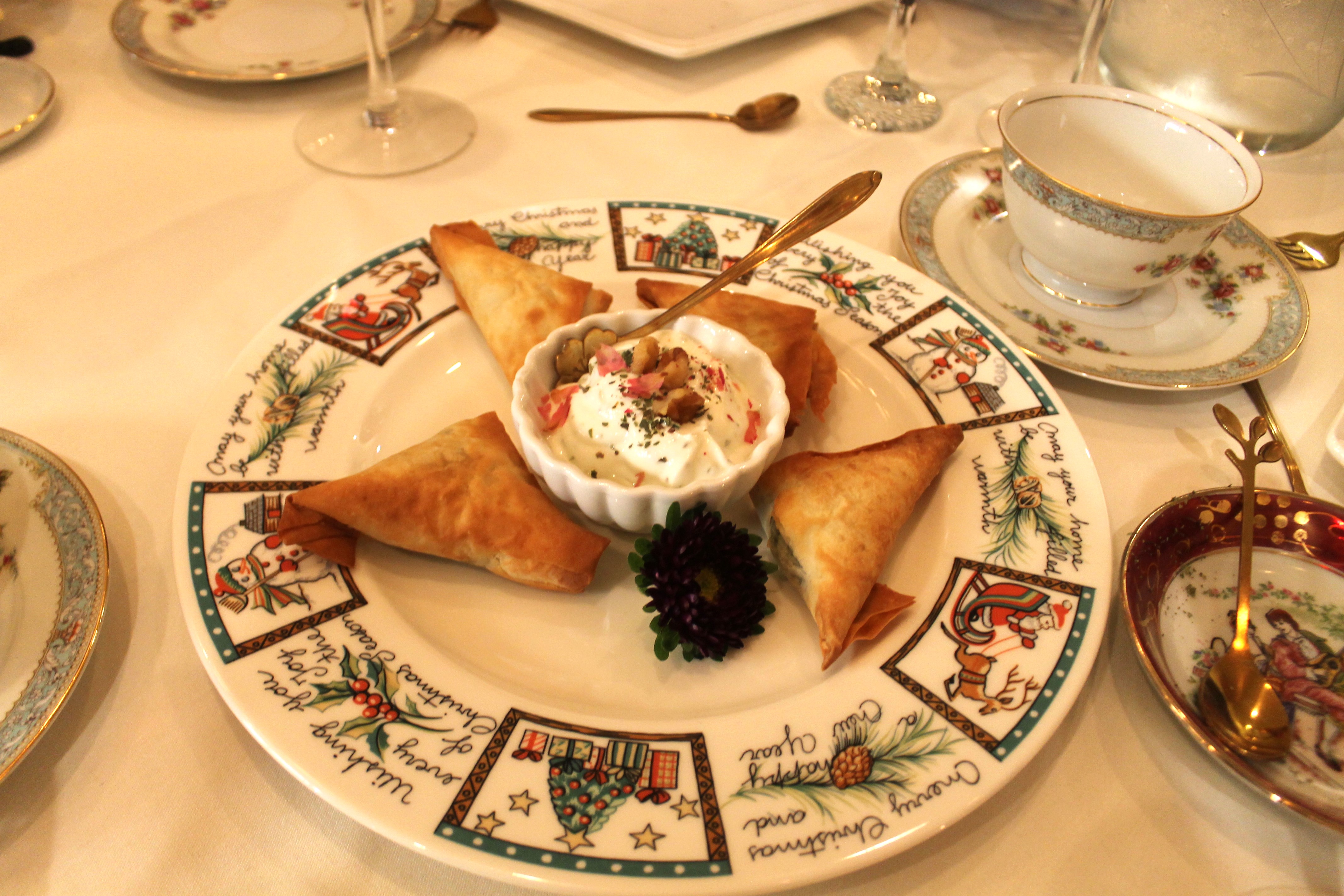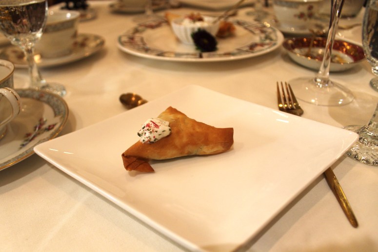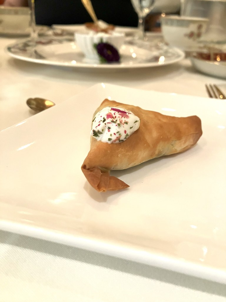 Spinach Filo (Filo pastry filled with spinach and feta cheese served with cucumber yogurt) – How cute is it that we got a 2nd course of Savories!? This pastry was soo comforting!! Warm + crispy. Who doesn’t love spinach filling? And that yogurt sauce, completed this so nicely.