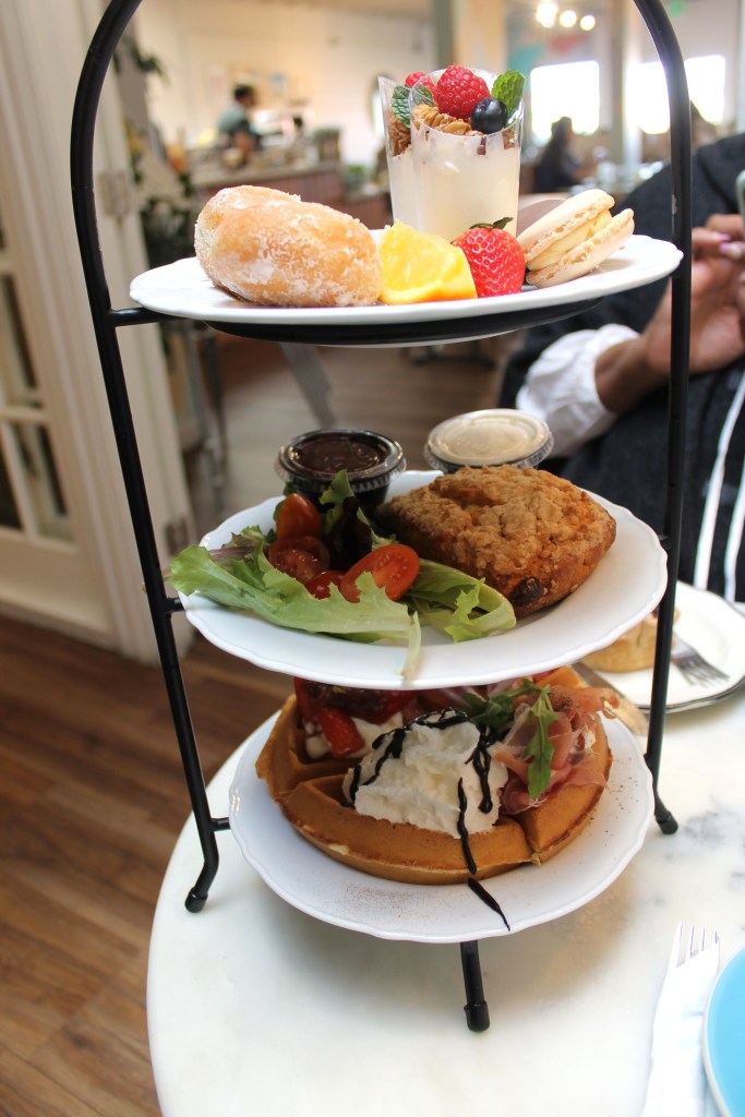 We seriously didn’t know what to do with ourselves when the tiers (excuse me, Towers) came. I think we sat stunned for a few, before accepting what was in front of us. So, me + my Tower Partner chose waffle bases right. Already having to compromise our 4 flavors, we thought we were going to get TEA FOR TWO!!?! It was Tea for ONE yall. There were 4 waffles, with the 4 flavors, only. That meant: if we wanted to try each of the 4, we had to cut the pre-perforated waffle iron waffle QUARTERS in HALF!!?! This what I had to work with yall-
