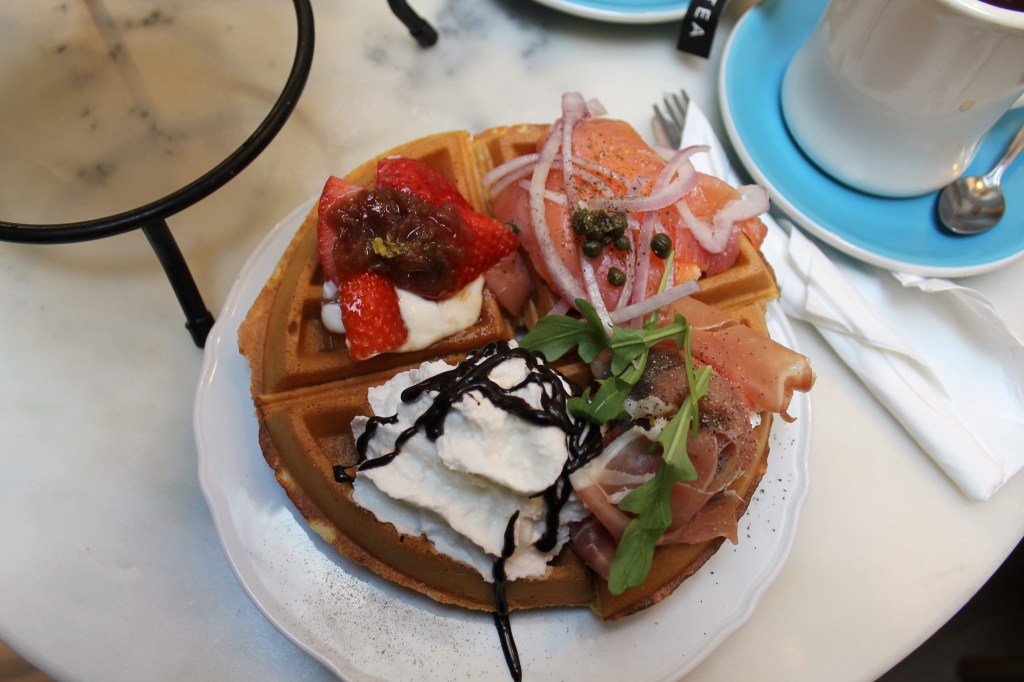 It took me several bites, before I could even take notes on what I was tasting. I chose the waffle base since that was a first for me for afternoon tea. It was a good waffle batter, fluffy + light, almost melts in your mouth.