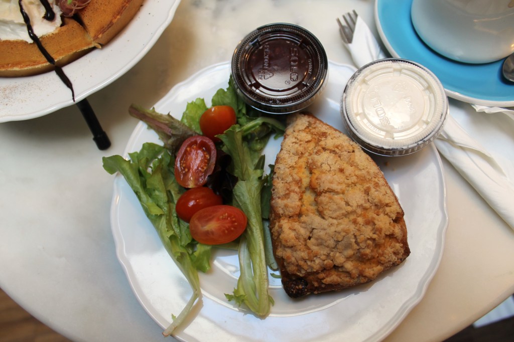 At the register ooonce agaaain, and now we’re ready! We thought. We come prepared with our shared flavors, aaand- we did it wrong again! Apparently, we chose the TOAST flavors but needed to choose from the WAFFLE flavors if we wanted waffle bases. We quickly figured out what 4 waffle flavors we were going to share while in line (cuz we weren’t about to come up for a FOURTH time), and finally did it right! Then, you choose between a scone or quiche. And when you choose either of those, there are then flavors of THOSE to choose from. [SIGHHH]