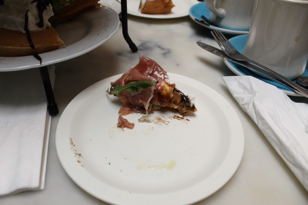 Prosciutto + Ricotta – My eighth had whipped cream on it, so there’s that. My notes say: “a lot of cream, had lots of cream.” I guess there was a lot of cream… It was a nice start, promising.