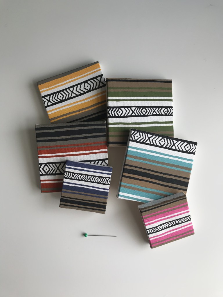 July 2019 – My Sister dropped off a bunch of extra art supplies she had lying around the house, including some canvases. All different sizes. When I started my trauma recovery and started painting, it was mostly objects. I had never tried my hand at canvas before… I created my first piece on 7/18/19. There were some tiny ones from that box too, a 3-inch by 3-inch. I had been painting abstract seascapes and wanted to keep with the coastal theme. I was obsessed with Mexican blankets. They just reminded me so much of our time spent with the ocean, and that brought me so much comfort. I love their pattern and thought I would try and paint one! Something about creating those lines over and over, calmed me. I painted more. Then more. Didn’t know what to do with them, until someone suggested I try to sell them online. What? No one cares about these! I tried. They sold out. I kept creating more and people kept buying more. One customer commissioned TWENTY to be made!! When I moved onto serape blankets, oh everyone wanted those. These were tiny canvases. Intricate pieces. Some took me HOURS to finish. The first time I felt “successful” was when I sold one of my 3″x3″ paintings for $125.00 and someone was actually EXCITED to pay me that much money for my art!!?! Yeah. Talk about brain explosion emojis! After I made my first couple hundred bucks, I went back to that artist (Chris Ouk of Wikid Canvas) I found at the food truck event- and commissioned my own piece. What a full circle moment.