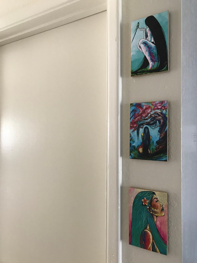 May 2019 – I remember walking through a food truck event with my family. Yes, I’m there for the food. But my favorite part of those things are the booths! I love seeing all the independent vendors and small business shops of crafts + art. One in particular caught my eye. It was of a woman with really exaggerated long hair. I bought 3 pieces of his!! Haha.